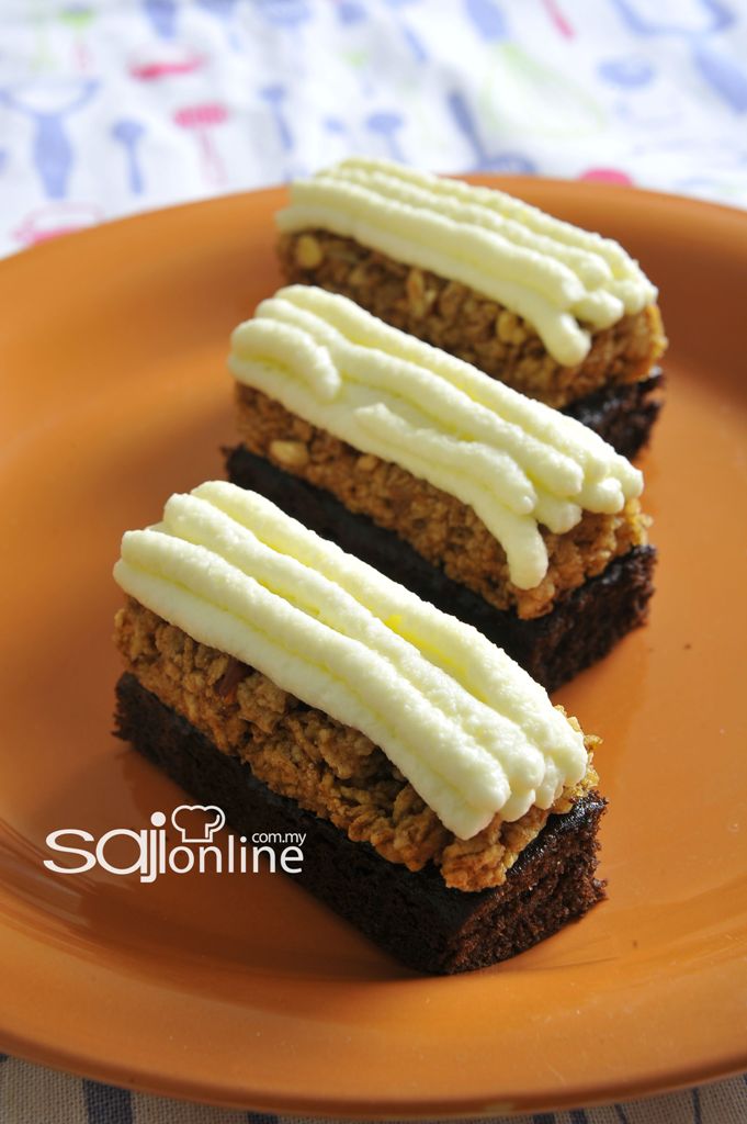 - Jadikan coklat kek sebagai asas, letak inti bijirin yang telah dibakar di atas kek dan paipkan krim di atas inti bijirin. Siap untuk dihidangkan.