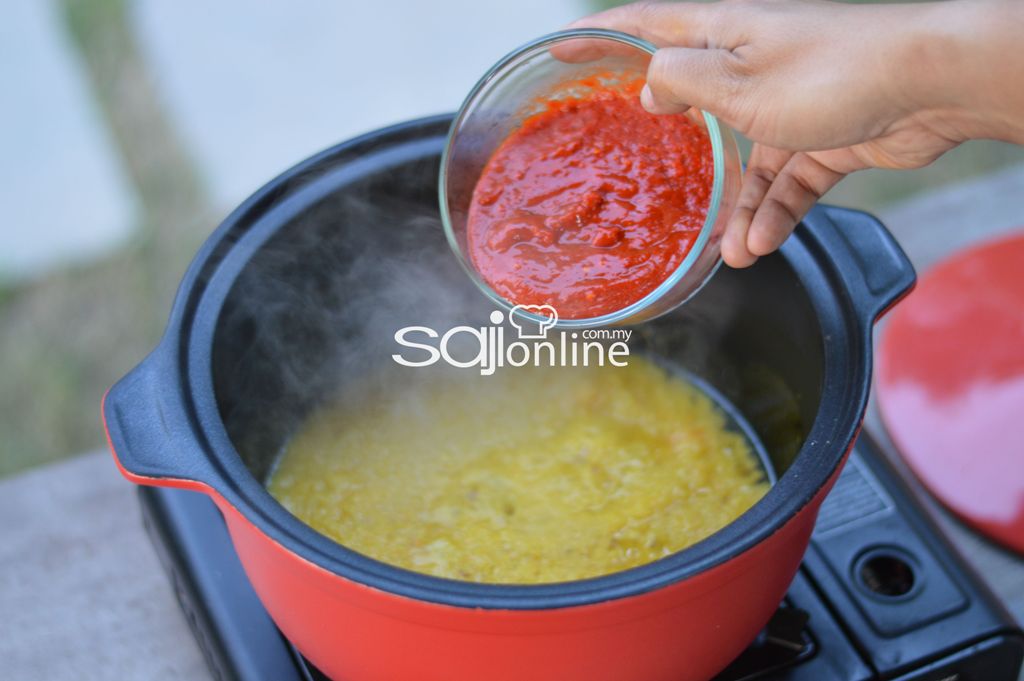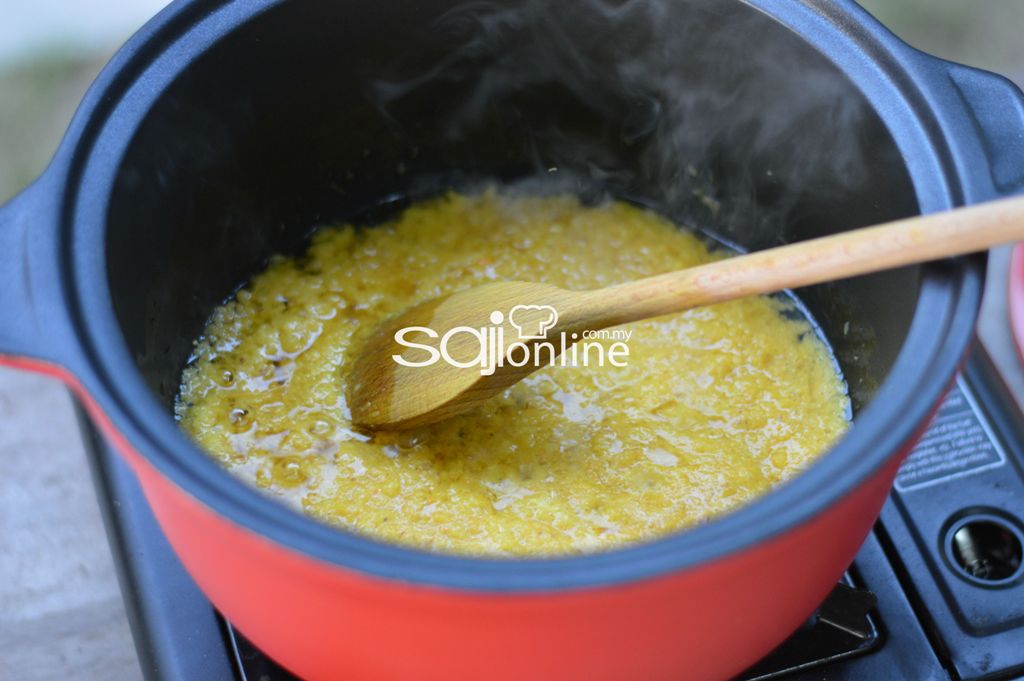1. Panaskan periuk dengan sedikit minyak. Tumis bahan kisar sehingga naik bau.