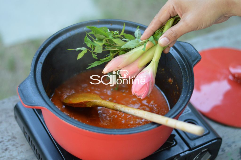 4. Masukkan daun limau purut, bunga kantan dan daun kesum.