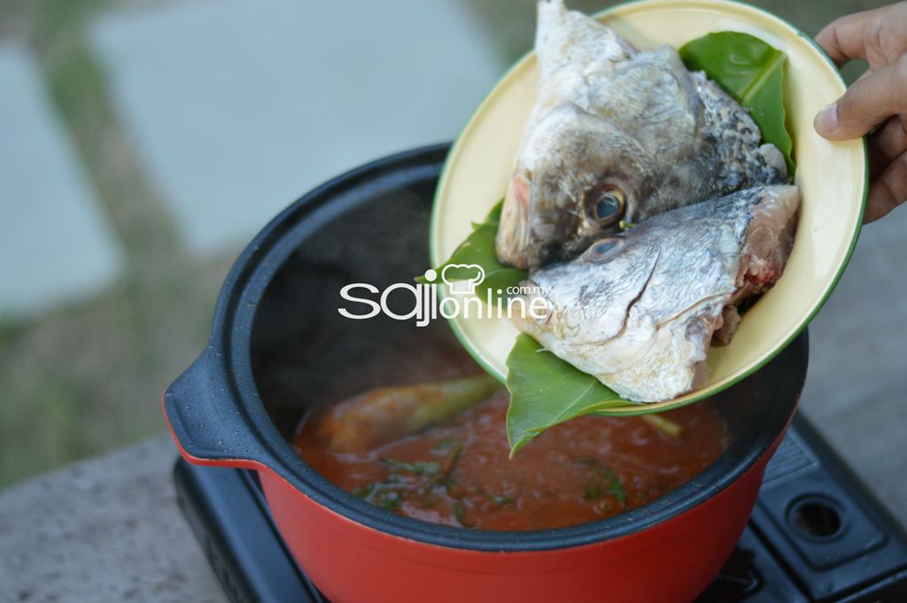 5. Perlahankan api dan masukkan kepala ikan jenahak dan biarkan seketika sehingga ikan masak sempurna. Perasakan dengan garam dan gula.