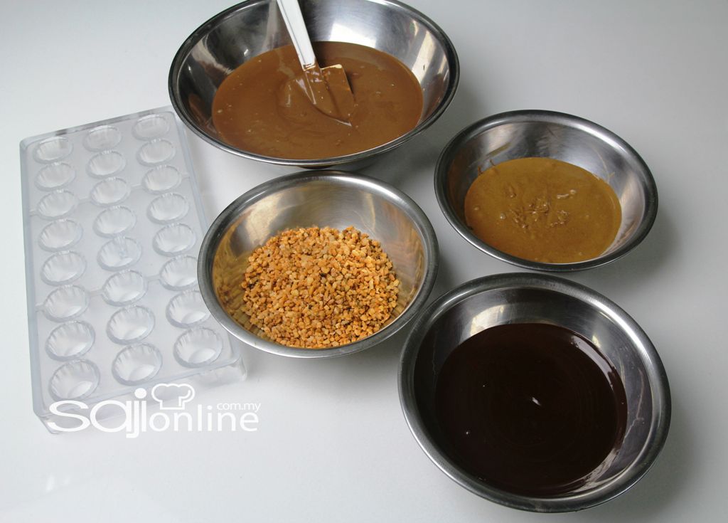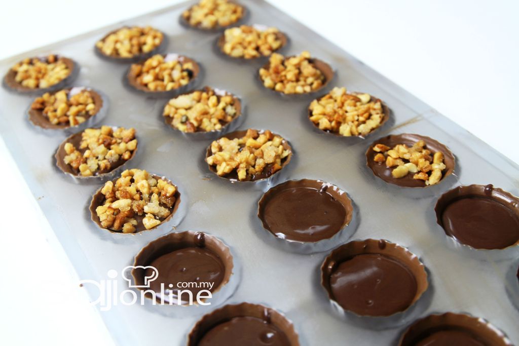 Tuangkan coklat susu ke dalam acuan – hentakkan sedikit agar padat. Biarkan selama 3 minit di dalam peti sejuk.