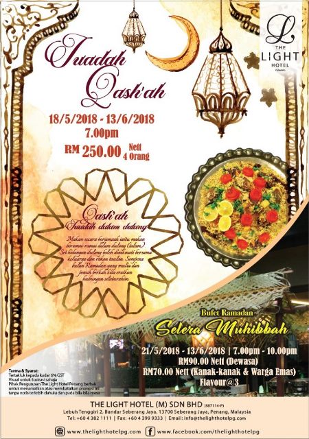 Menurut Eksekutif Cef, Halim Mohamad selain hidangan masakan Melayu Pulau Pinang pihaknya turut menyajikan hidangan masakan Barat, Cina dan India yang turut dibantu oleh Eksekutif Sous Cef, Murugan Balakrishnan dan Chinese Sous Cef H’ng Weng Kiang. Tunggu apa lagi, jom kita buat tempahan sekarang di talian 04-3821111 layari www.thelighthotelpg.com atau www.facebook.com/thelighthotelpg
