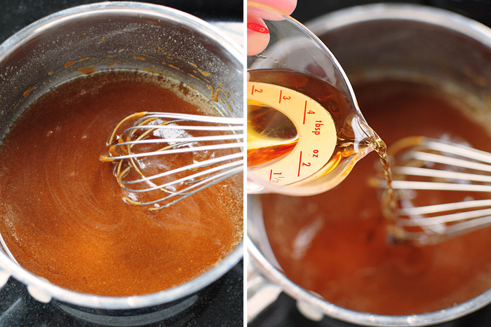Satukan mentega dan gula dalam kuali dan panaskan sehingga gula larut.