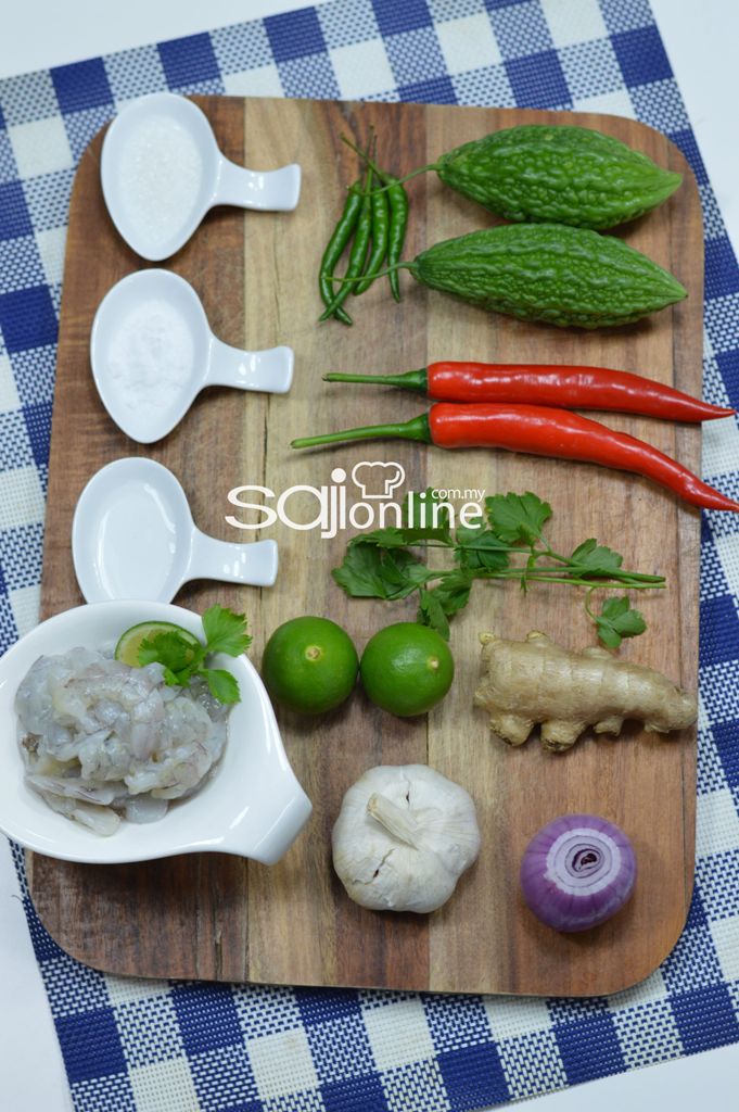 3. Di dalam mangkuk yang besar, campurkan peria, udang dan bahan-bahan yang lain.
