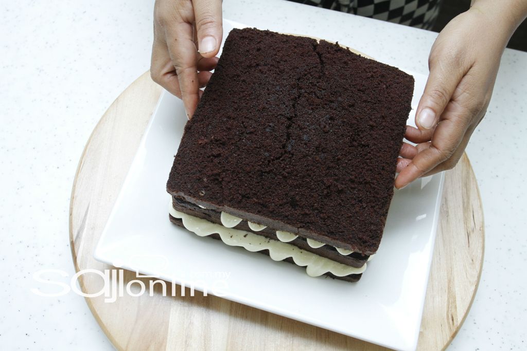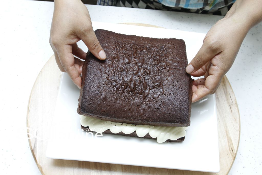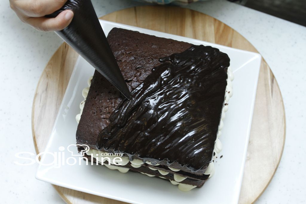2. Kemudian lapiskan dengan kek dan tuangkan topping coklat fudge.