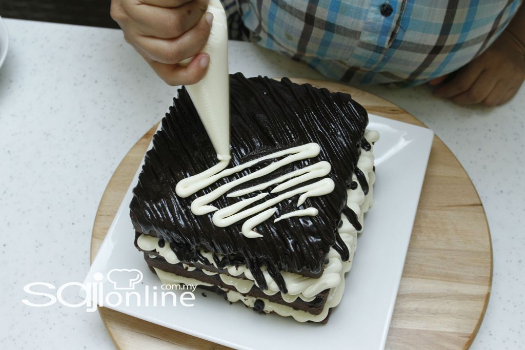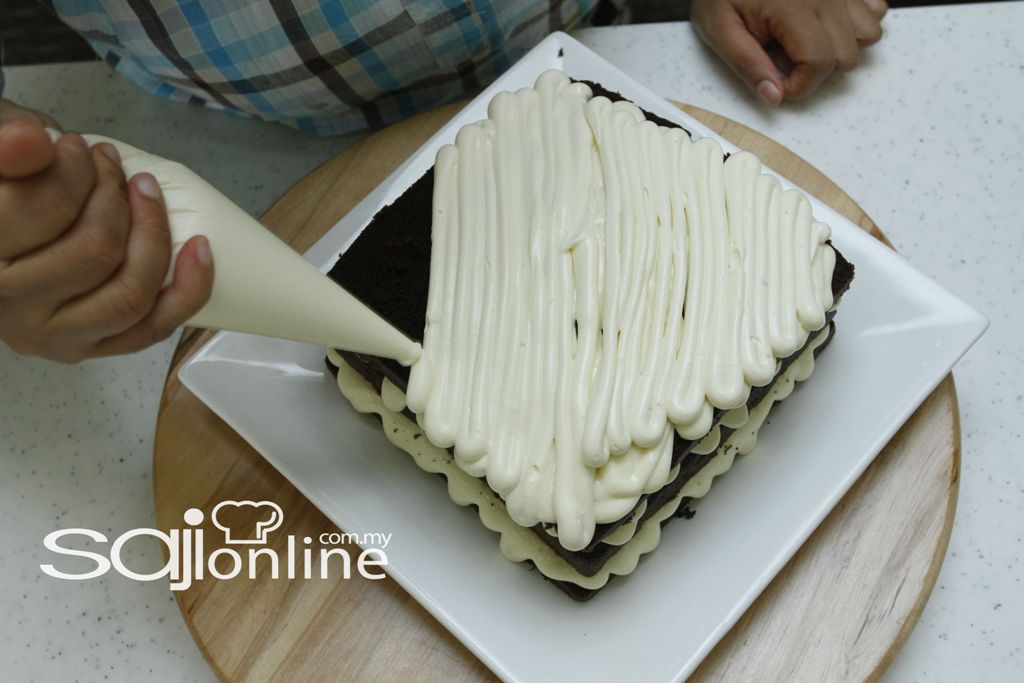 1. Potong kek, paipkan topping keju lava dibahagian permukaan kek .