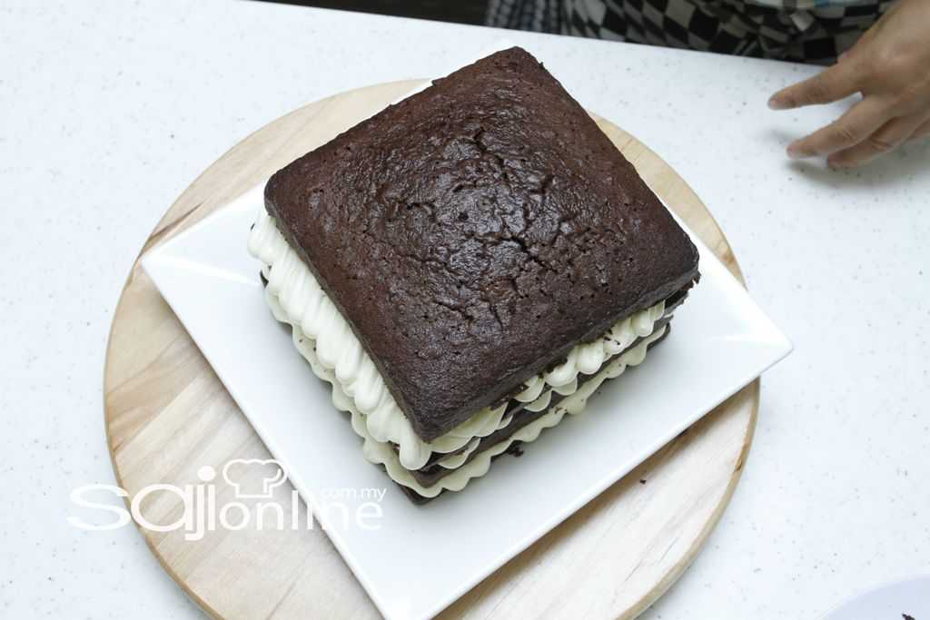 Kek coklat: Putar mentega, gula kastor dan ovalete sehingga berkrim. Masukkan telur satu persatu, putar hingga sebati.