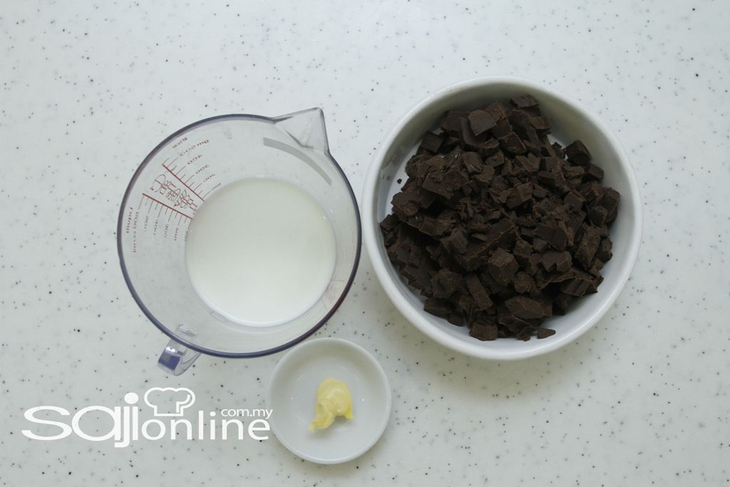 Panaskan coklat masakan menggunakan teknik “ double boiler”. Apabila cair , tuangkan susu segar dan masukkan mentega.