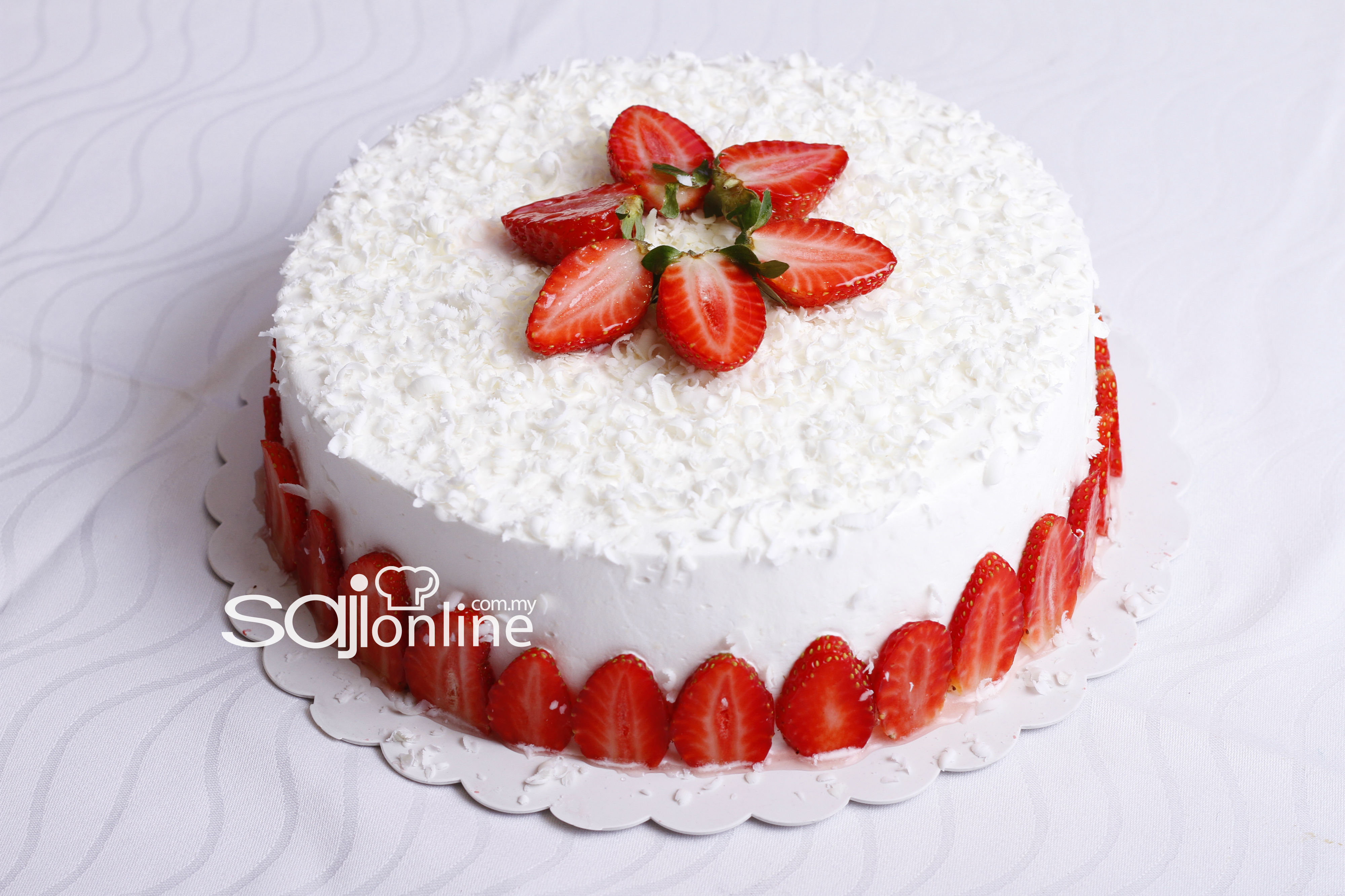 5. Potong kek span kepada dua bahagian dan lapiskan bahagian tengah dengan ganache putih dan letakkan lapisan kedua. Tuangkan lebihan ganache ke atas kek dan sapukan sekeliling kek dengan spatula. Hiaskan.