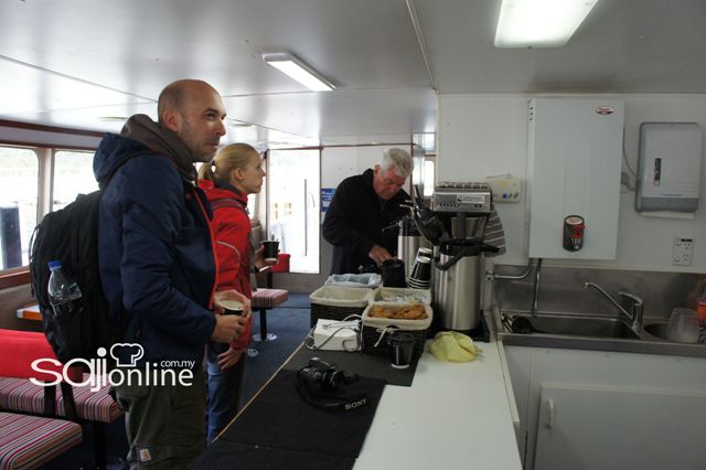 Sebaik nakhoda melabuhkan layar, bermulalah pengembaraan selama dua jam menuju Laut Tasman. Dengan cuaca sejuk tahap beku walaupun pada musim bunga, memang cukup awesome dihidangkan dengan teh o panas dan biskut. Apa yang pasti, masuk sahaja ke dalam perut kapal, semua penumpang terus menuju ke dek atas yang lebih eksklusif. Dan jika mahukan sesuatu untuk dikunyah, hanya turun ke bawah. Ada minuman dan biskut disediakan. PERCUMA.