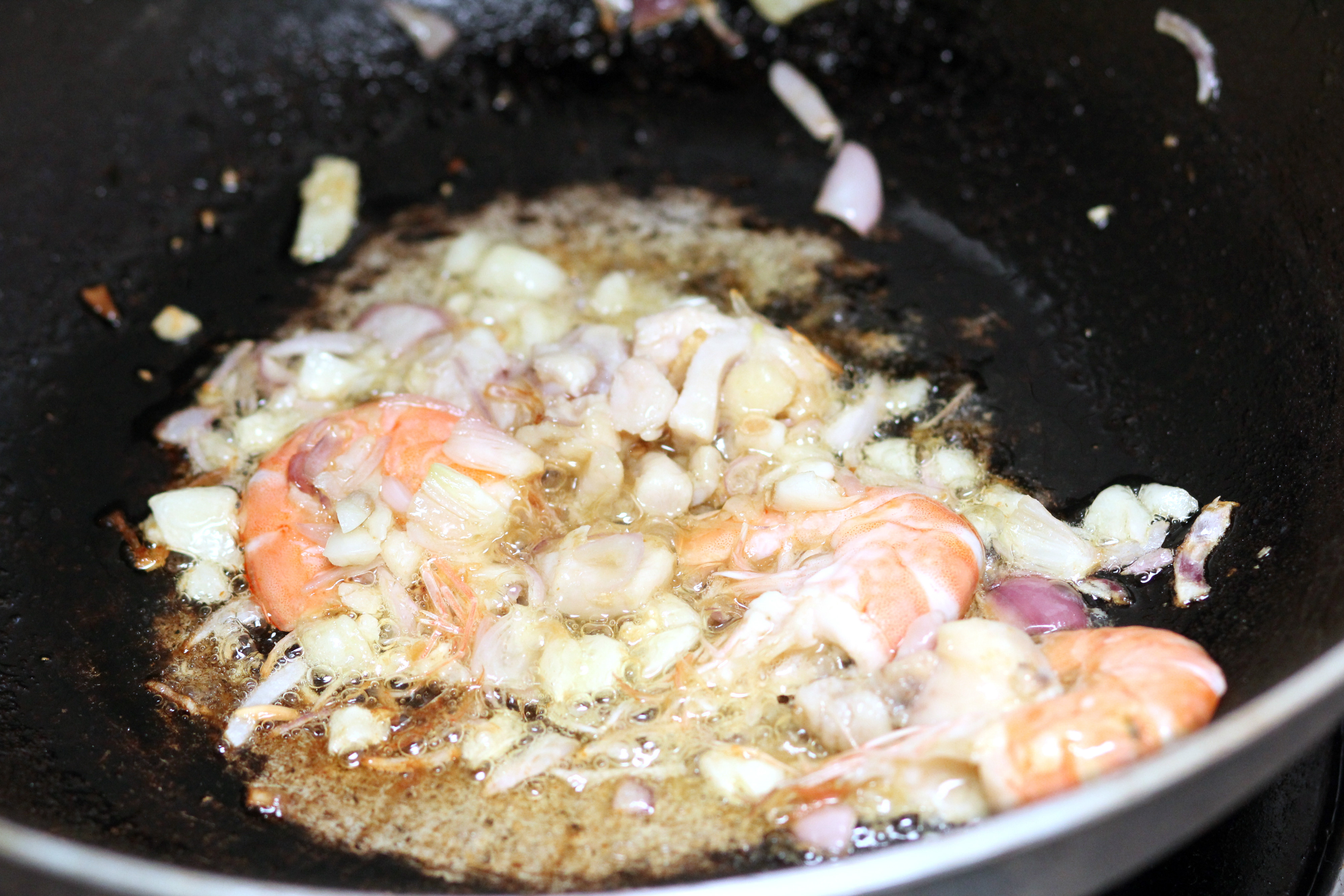 3. Masukkan udang, sawi, bebola ikan dan sos tiram. Kacau seketika dan sebatikan rasa.