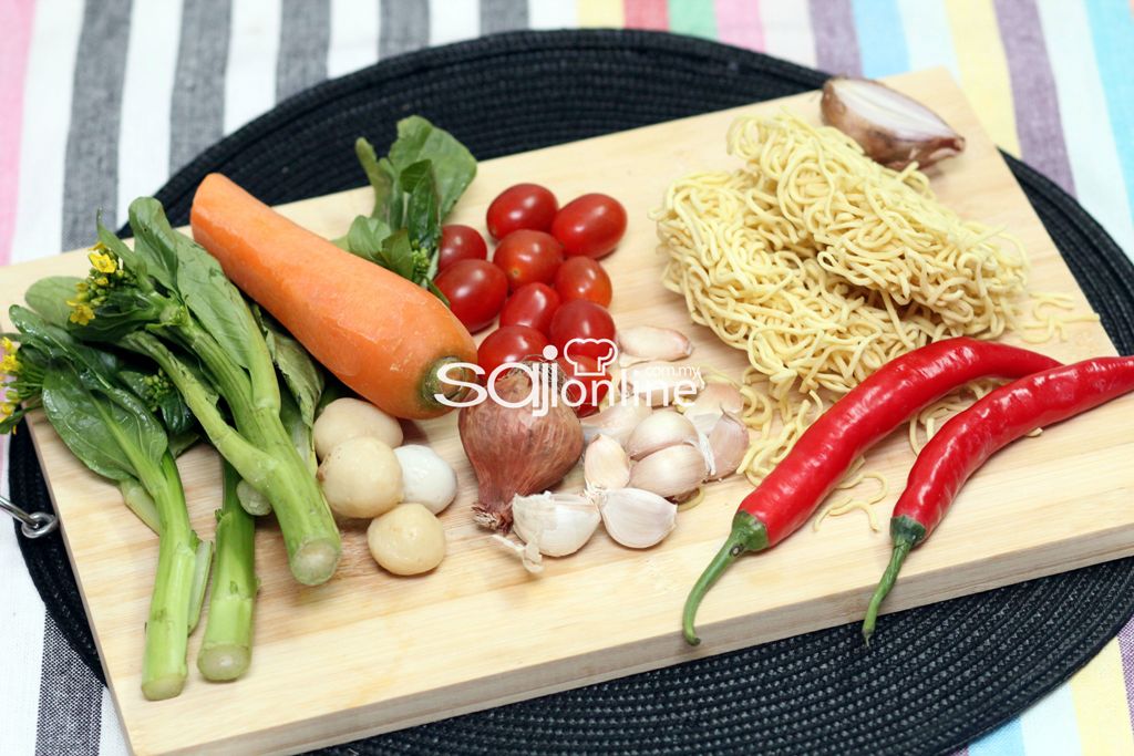 Kemudian, masukkan secawan air bersama lobak merah dan dibiarkan mendidih. Sebatikan rasa. Masukkan sawi dan mi sanggul. Biarkan mendidih sebentar dan tutup api.