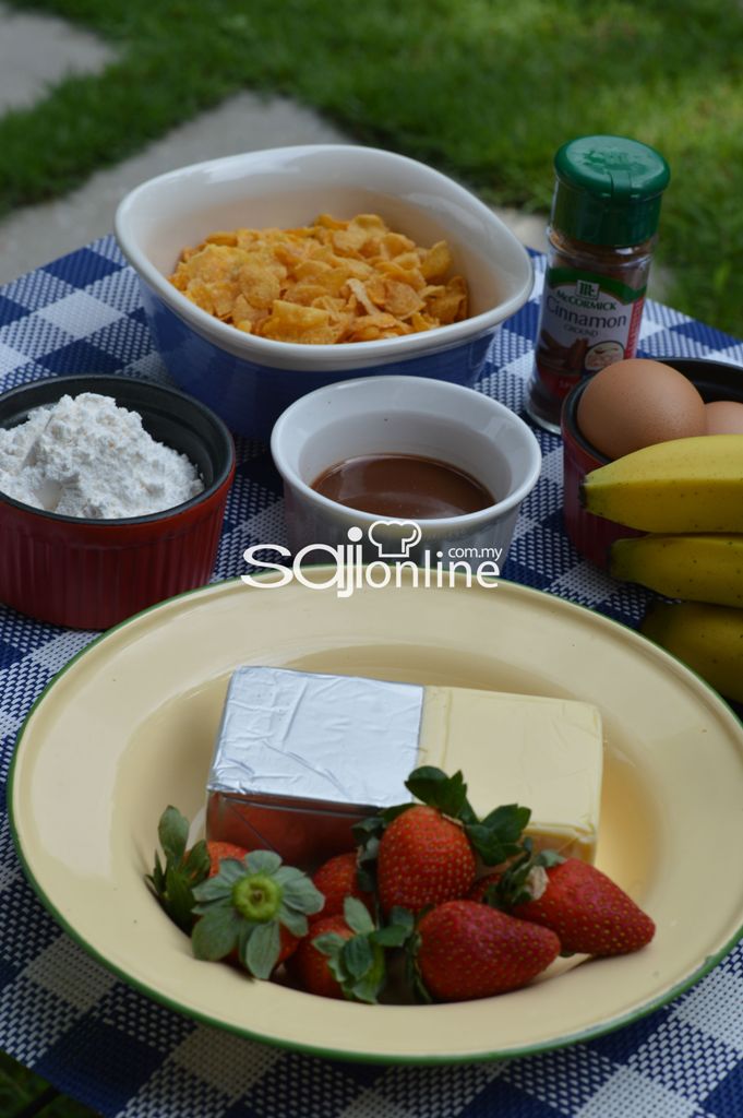 Buang kulit pisang dan sapukan dengan campuran tepung gandum dan serbuk kulit kayu manis.