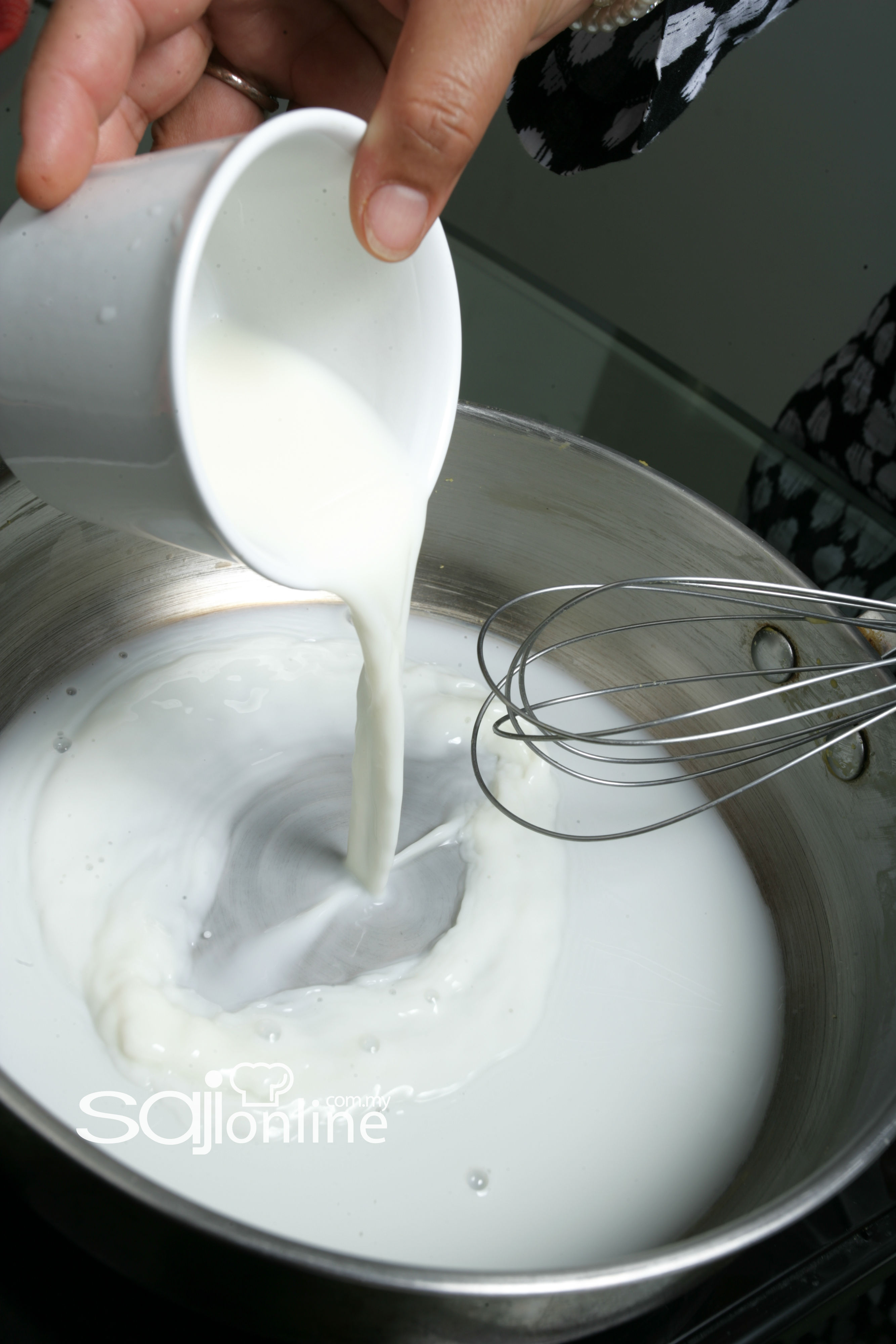 Satukan susu, gula dan serbuk agar-agar di dalam periuk. Didihkan dengan api yang kecil.