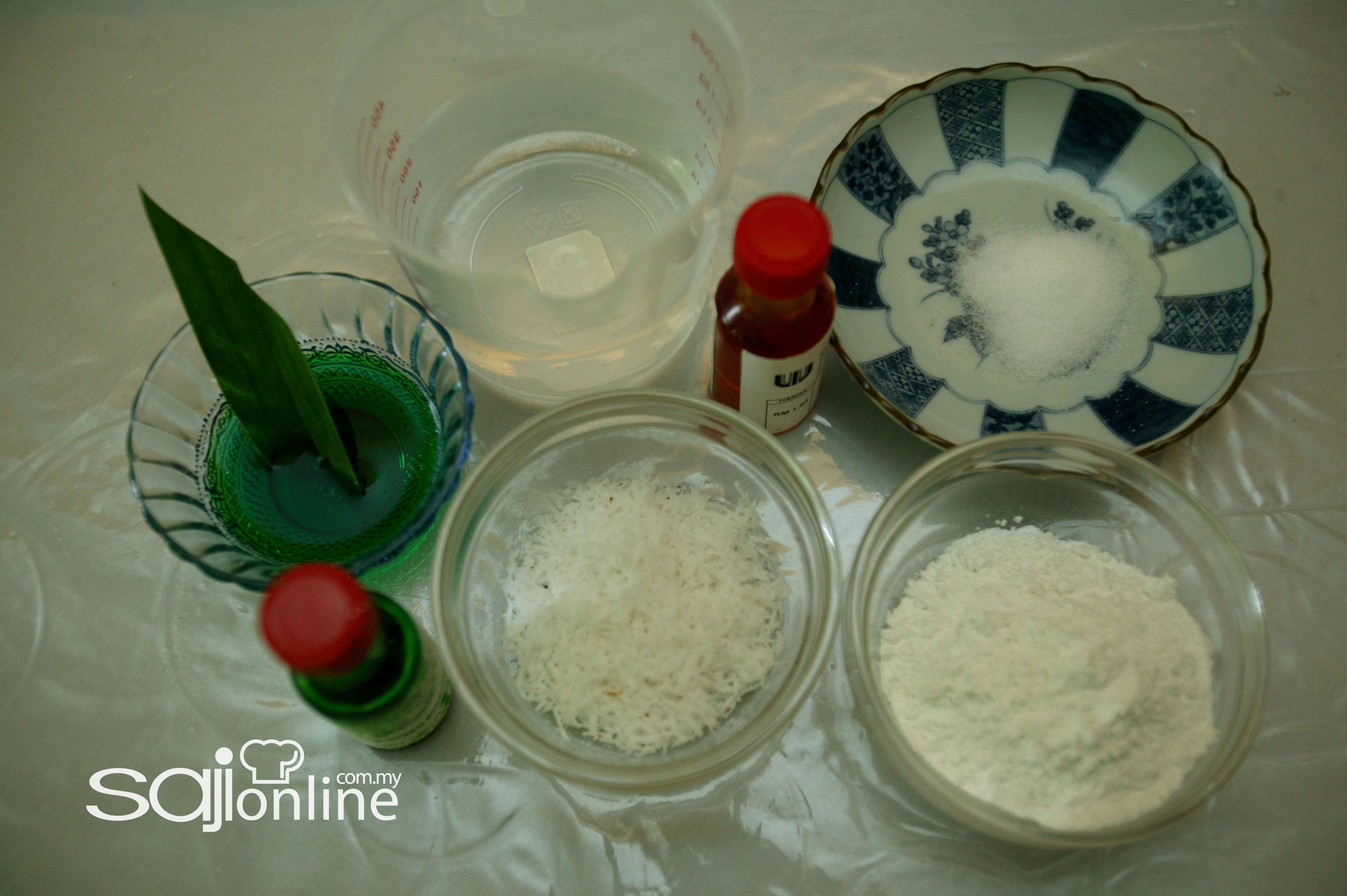 Campurkan tepung pulut bersama sedikit garam. Kemudian bancuhkan dengan air sedikit demi sedikit sehingga menjadi doh yang sebati.