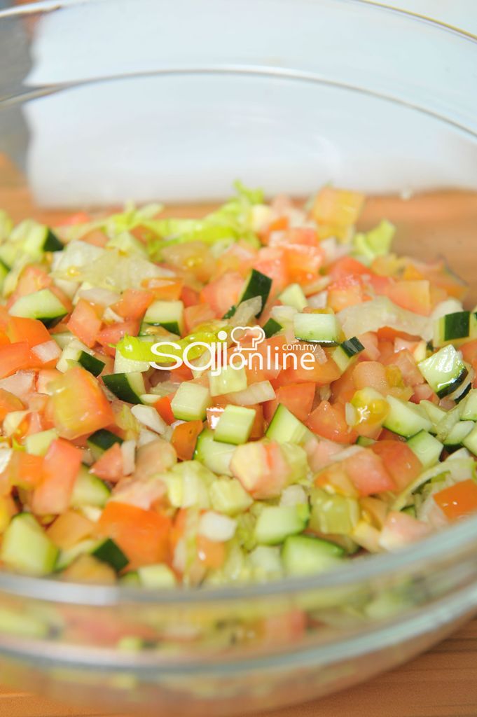 2. Potong dadu timun Jepun, tomato dan hiris bawang Holland. Satukan ke semuanya dengan salad di dalam mangkuk. Ketepikan dan simpan di dalam peti ais seketika.