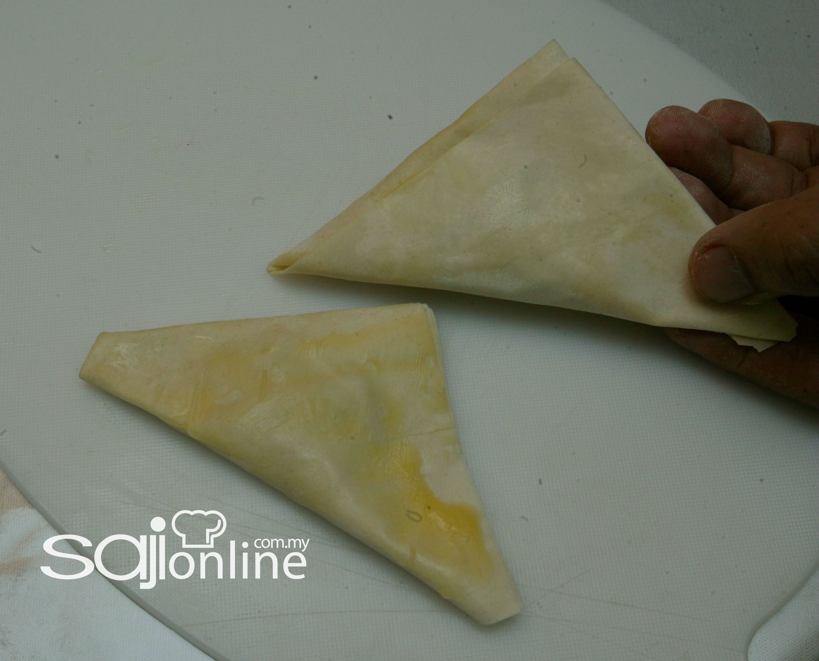 Ambil sekeping kulit fillow, sapukan mentega cair, kemudian ambil lagi sekeping kulit fillow dan ulangi proses yang sama sehingga menjadi tiga lapisan kulit fillow.