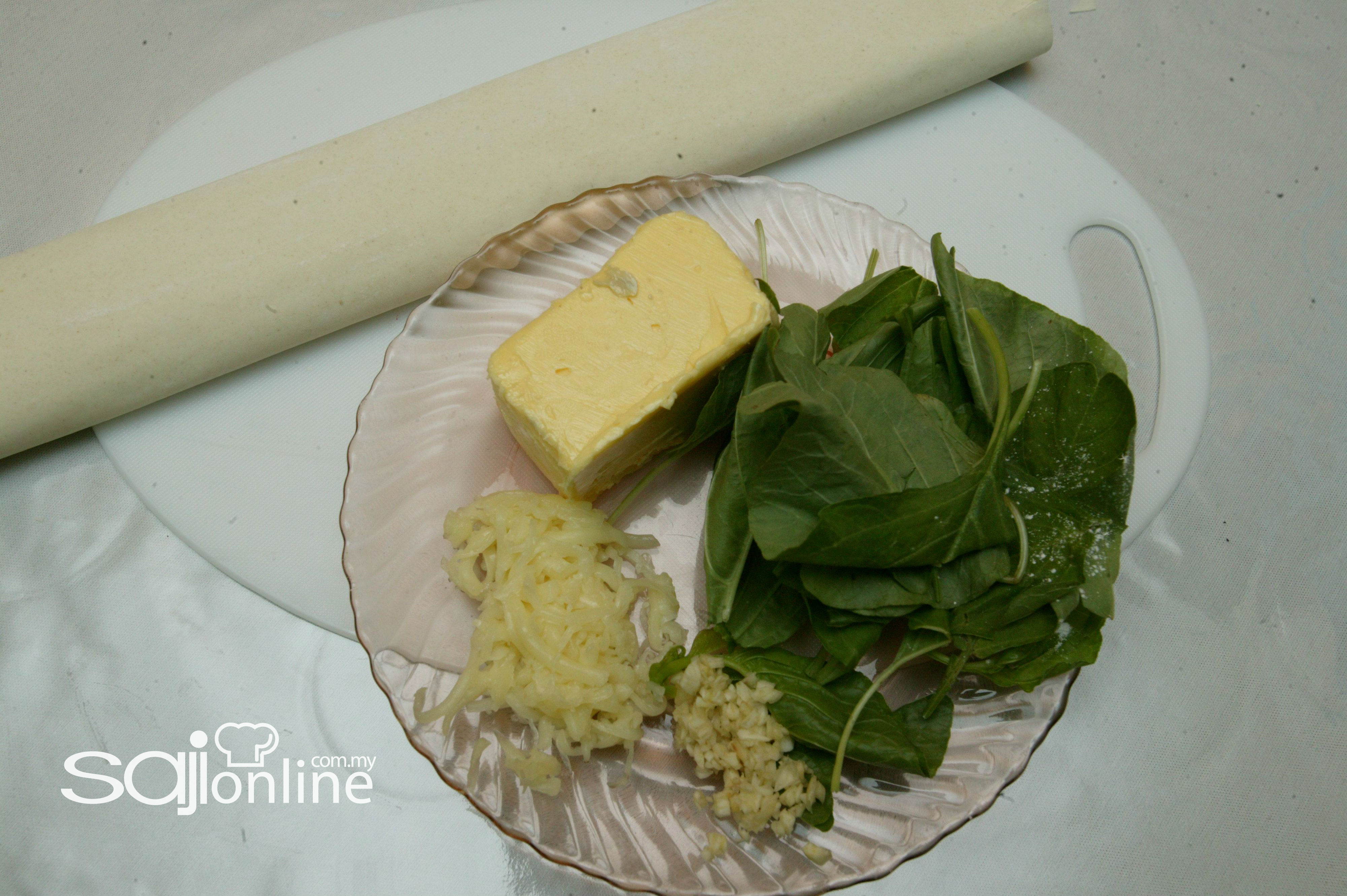 Masukkan daun bawang dan garam kacau hingga daun bayam layu. Angkat. Masukkan keju kacau hingga rata, sejukkan.